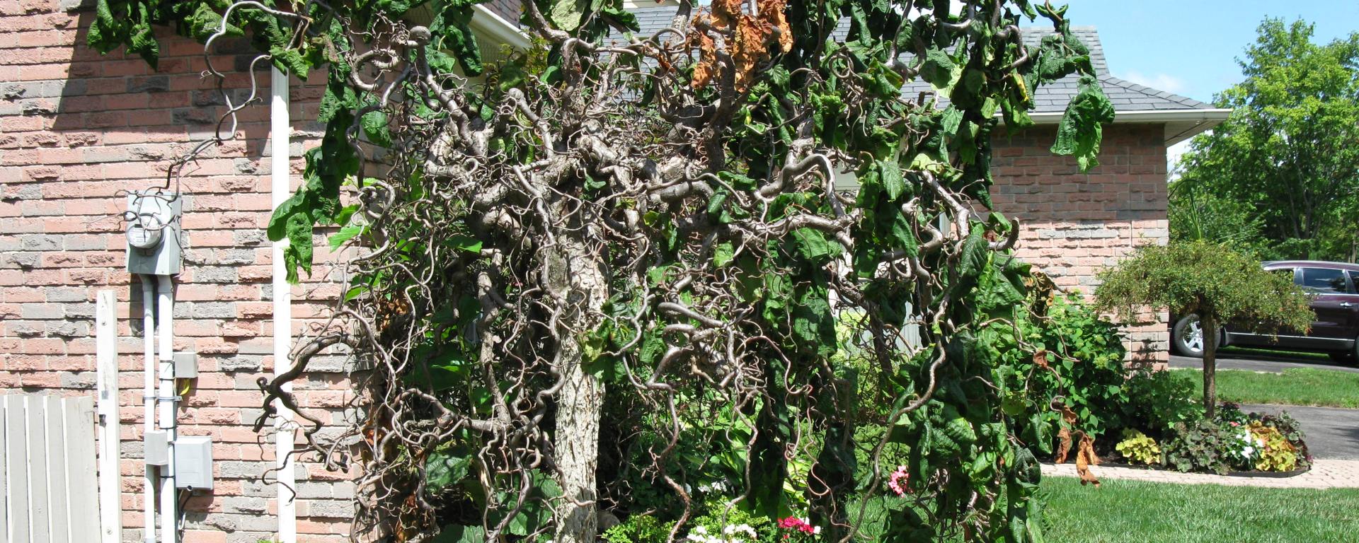 Eastern Filbert Blight is a disease caused by the fungus – Anisogramma anomola and is native to the northeastern United States and eastern Canada (although it has appeared in British Columbia, as early as 2001). Hazelnuts native to this region (Corylus americana) have proven to be more resistant to the disease (some are even immune) than the imported European hazelnuts (Corylus avellana). For Harry Lauder’s Walking Stick, a contorted hazelnut (Corylus avellana ‘Contorta’) the disease is lethal.