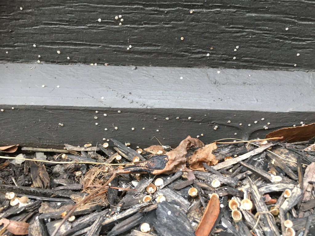 As already mentioned the fungi appear like tiny birds nests filled with eggs. The bowl or nest like structure is called the peridium (or peridia in plural). They typically have a brown cup-like structure with a smooth interior and measure approximately 6mm-16mm (¼” to 5/8″) in width and height. Inside the nests, egg-like structures, called periodoles, appear; these fungal fruiting bodies range in size from about .7mm-1.6mm (1/32-1/16″) in width. New nests begin appearing typically early fall in moist, cool locations with lots of organic matter, such as wood mulches.