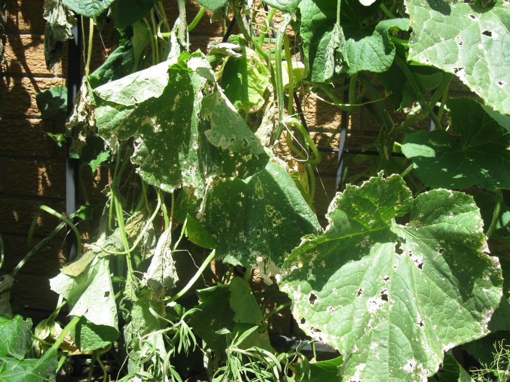 The cucumber plant picture above will have to be destroyed. It has been infected with the Bacterium – Erwinia tracheiphila, causing what is referred to as Cucumber Wilt or Bacterial Wilt. The bacterium overwinters in the bodies of hibernating cucumber beetles who then introduce the bacteria into the plants through the fecal contamination of feeding wounds. The disease appears first as patches of discoloration, followed by a sudden wilting of the plant. The wilting damage to the cucumber plant pictured above occurred in the space of 2-3 days. The beetles are also known to spread squash mosaic virus. All cucurbits, except watermelon are potentially affected by the disease.