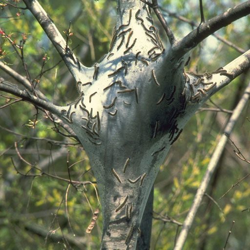 Tent caterpillars construct their silky tent like nests in early spring in the crotches of trees such as cherry (Prunus) and apple (Malus). They feed during the day, then at night they return to the tent for protection. Your first line of defense should be to begin looking for these nests in early spring, about the time saucer magnolia (Magnolia x soulangiana) and crabapples are at bud break. Once located remove the nests and burn them, where permitted. Alternatively cut the tent open and hand pick the caterpillars throwing them into a bucket of soapy water. These 2 methods are most effective because large numbers can be removed at once. (Be sure to wait until they have returned to the nest for the evening before removing the nest). Your second line of defense is spraying them with Btk (Bacillus thuringiensis var. kurstaki). Check for egg masses in the fall and spring and remove any you may find by scraping the clusters with a knife; prune trees in late fall or early spring also helps to keep populations low. Some natural enemies of tent caterpillars are birds and rodents. If physical and biological measures are not effective, use a pesticide which will have a minimal impact on both you and the environment. Apply dormant oil in late winter to kill the eggs before they hatch. An insecticidal soap is another option for control of the eastern tent caterpillar.