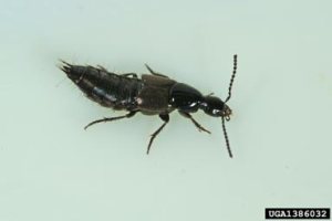 Rove beetles’ appearance varies somewhat according to it’s species but overall adults are black or brown in colour, long and slender measuring up to 2.5 cm (1″) in length. They look a lot like earwigs without front pincers. They do however have a large mandible (lower jaw) that they use to grasp their prey. They have 2 sets of wings with the forewings being short, thick and hardened to protect the hind wings. A distinguishing characteristic is the way they raise up the tip of their abdomen, like a scorpion, when disturbed or threatened, even sometimes when they are running. They are fast runners in addition to being good fliers. The larvae look similar to the adults but are wingless, tan in colour with dark heads. Avoid handling these beetles as they can release a toxic fluid called paederin that can cause contact dermatitis.