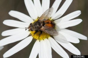 Tachinid fly adults are pollinators, but their larvae are a parasitoids who feed on a host caterpillar or insect, thus killing it. The adult females lay their eggs either on, in or near the targeted host. When they hatch a few days later the larvae begin feeding on the host causing its death. Most tachinid flies are host specific and only parasitize a specific species or a narrow range of similar species. The preferred hosts are caterpillars and the larvae of beetles but there are also species that feed on sawfly larvae, stem borers, several species of worms, aphids, grasshoppers, scale and other insects. There are over 10,000 species worldwide (O’Hara J.E., 2008). with about 1300 of those appearing in North America (Mahr S., n.d.).