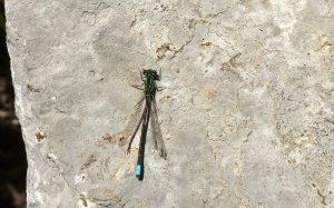 Dragonflies belong to the odonatan order along with Damselflies. Most people are familiar with adult dragonflies which are most readily identified by their (usually) brilliant metallic colours and their precision, agility and speed of flight, being able to reach speeds of 30 miles per hour. Other distinguishing characteristics include: 2 pair of narrow, transparent wings that are held flat and away from the body when they are at rest; long slender and elongated bodies and large compound eyes. They are voracious predators capable of highly accurate aerial ambush of primarily mosquitoes and Midges, but they also feed on many other flying insects including flies, moths, bees, butterflies, beetles and even other dragonflies. They are active by day and commonly found near fresh bodies of water. The larvae live in fresh bodies of water feeding on aquatic insects and occasionally tadpoles and small fish. The larvae have an abdomen ending in five points.