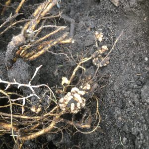 By contrast, root-knot nematode disease is caused by microscopic worm like, parasitic nematodes of the Meloidogyne species. These nematodes live in the soil of warmer climates or ones with short winters. These nematodes burrow into the roots of some 2,0000 species of susceptible plants to feed on the plant’s sugars, causing abnormal swellings on the roots. The appearance of the galls varies according to species but “generally, fast growing annuals will have a large flesh gall and woody perennials, small hard galls” (Texas A&M AgriLife Extension, (n.d.)). These swellings, unlike the nodules discussed above, occupy the entire circumference of the root rather than on the side of the root. The individual galls can also get larger measuring from 3mm-50mm. They can also fuse together causing large sections of the root to be swollen. Other root symptoms may include a darkening of the roots, rotting, stunting and lack fine feeder roots or a proliferation of lateral roots on root vegetables (“hairy roots”). Above ground symptoms may include chlorotic or pale green leaves, stunting, wilting (especially during the heat of the day), reduced yield, reduced resistance to disease and nutrient deficiencies. Root-knot nematodes can even attack legumes and interfere with root nodulation and nitrogen fixation.