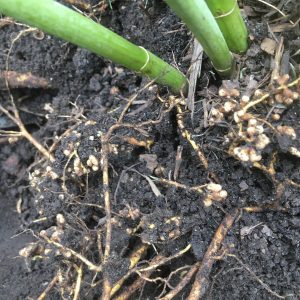 Root nodules take on many shapes and sizes depending on bacteria and plant species. Nodule size can vary from 1-10mm. Healthy nodules, that are actively fixing nitrogen are pink on the inside. They turn green when they are no longer fixing nitrogen and may be discarded by the plant. When nodules appear white or grey on the inside it means they have not yet started fixing nitrogen. The nodules appear on the root hairs or on the side of the root and are easily detached. Plants that have these nodules typically appear healthy even robust.