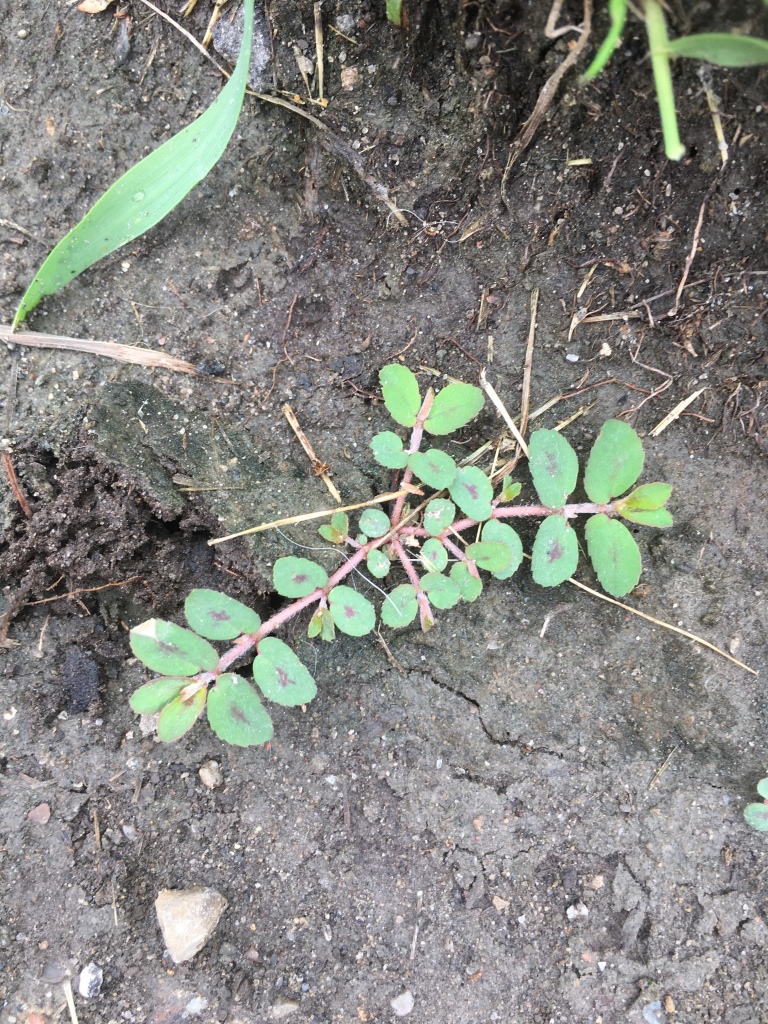 These 3 summer annual species in the spurge family (Euphorbiaceae) and are very difficult to tell apart. Spotted spurge, as the name suggests has leaves that often have a reddish spot, or blotch in the center of their dark green leaves. These plants grow in a low, highly branched matt that can grow up to 90cm (3′) in diameter. The leaves are arranged opposite each other on pink to reddish hairy stems that DO NOT root down at the nodes like the 2 very similar species Euphorbia humistrata and Euphorbia prostrata. When broken the stems bleed a white milky substance that can irritate your skin and eyes. The roots are well branched with deep tap roots (up to 60cm or 2′ deep), that can resprout from fragments left in the soil. Flowers are nondescript tiny little pinkish to pale green clusters tucked into the leaf axils near the outer branches. Flowers in the summer June through to October. Flowers quickly give way to an abundance of sticky seeds that can quickly germinate or remain in the soil, sprouting when conditions are right, for years to come.