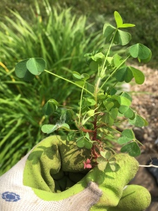 Wood Sorrel Control: can be dug out from garden beds being careful to remove all the root. Root fragments that remain in the soil can resprout. They are more challenging to remove from lawns, especially creeping wood sorrel. Establishing a thick healthy lawn is your best defense against this weed. In interlocking brick, they often break when pulling, loosening the soil around the root with a knife can help in their removal. Cleaning vinegar (Acidic acid) sprayed on wood sorrel plants in sidewalks and driveways, especially on a sunny day, may top kill this weed.