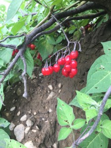 • Climbing nightshade (Solanum dulcamara) commonly called bittersweet nightshade, is a highly invasive perennial vine that grows to about 2m but can reach up to 4m. They can climb using other plants for support or trail along the ground. They have purplish star shaped flowers in summer (June-July) with 5 petals that are followed by clusters of bright red berries. Youngest leaves are oval to ovate with pointed tips and are hairy with smooth margins, while more mature leaves often have basal lobes and measure about 2 to 5 inches long, often with a purplish tinge and emit a foul odour when crushed. Leaves alternate up the stems which are woody at the base, hollow, slightly hairy, and mature in colour from purplish to green then greenish-brown then finally woody. Vines are able to root down at the nodes.